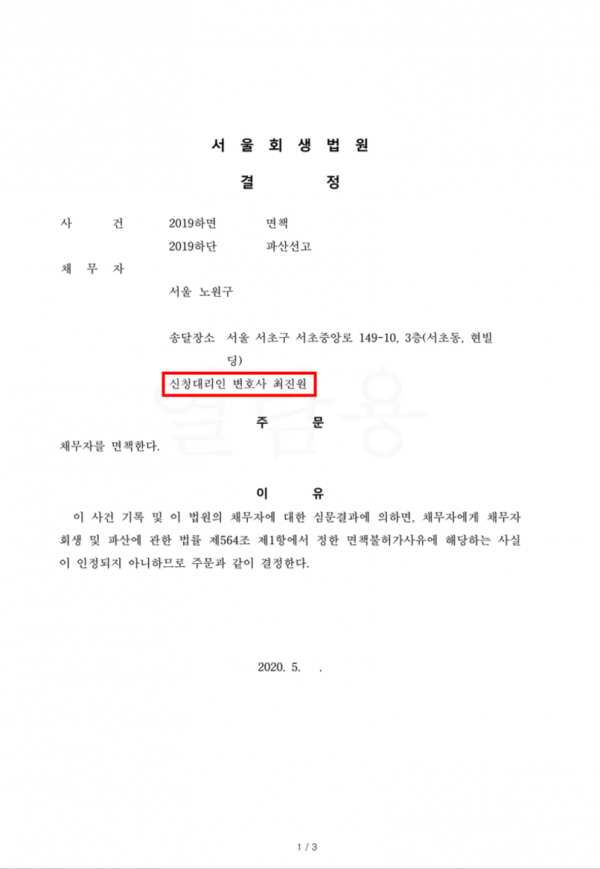 개인파산전문 법률사무소 온길 최진원 변호사는 2019. 11.경 서울회생법원에 파산 및 면책 신청을 하여 2020. 5.경 면책허가 결정을 성공적으로 받았습니다.