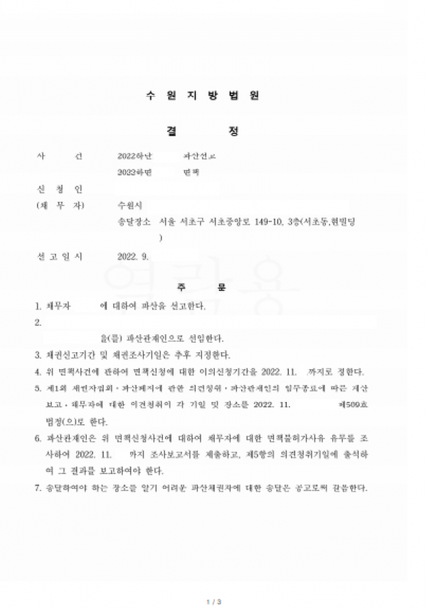 대표자 개인파산전문 법률사무소 온길 최진원 변호사는 2022. 4.경 수원지방법원에 파산 및 면책 신청을 하여 2022. 9.경 파산선고 결정을 성공적으로 받았습니다.