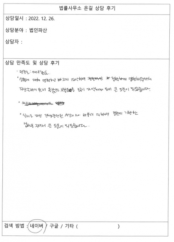 법인파산에 대해서 걱정이 많으셨는데 상담을 통해 문제점들의 해결방안을 찾으시고 상담후기를 작성해 주셨습니다.
