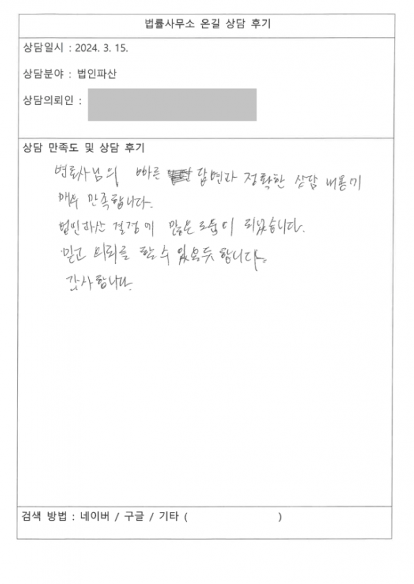 법인파산에 대해서 걱정이 많으셨는데 상담을 통해 문제점들의 해결방안을 찾으시고 상담후기를 작성해 주셨습니다.